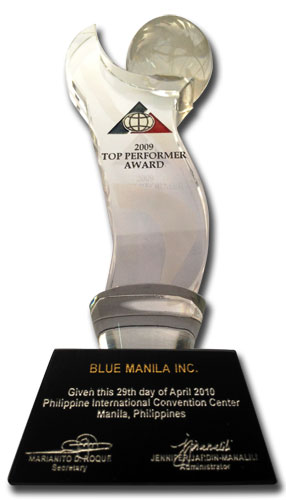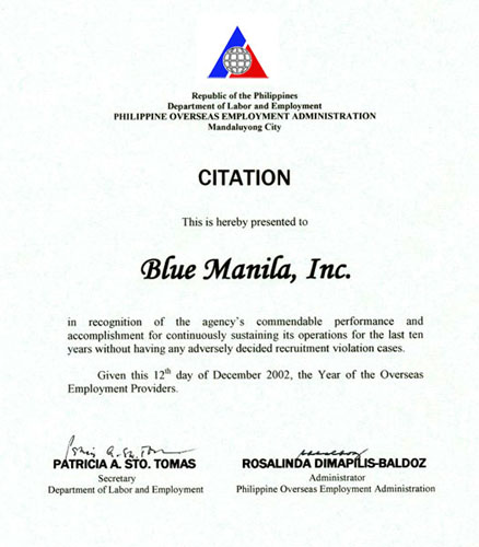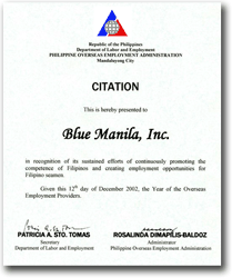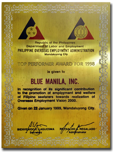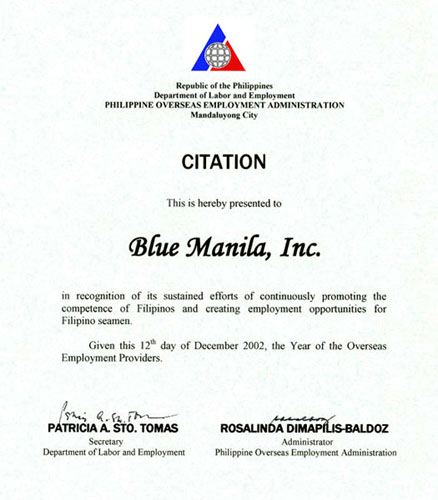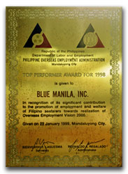 ISO CERTIFIEDThe Quality of Blue Manila, Inc.’s services has been certified by the International Organization for Standardization (ISO) since 1996 as a quality assured company. POEA TOP PERFORMERThe company has been awarded by POEA in 1998, 2002 and 2009 as one of the agency’s Top Performers in the Philippine Manning Industry. |
